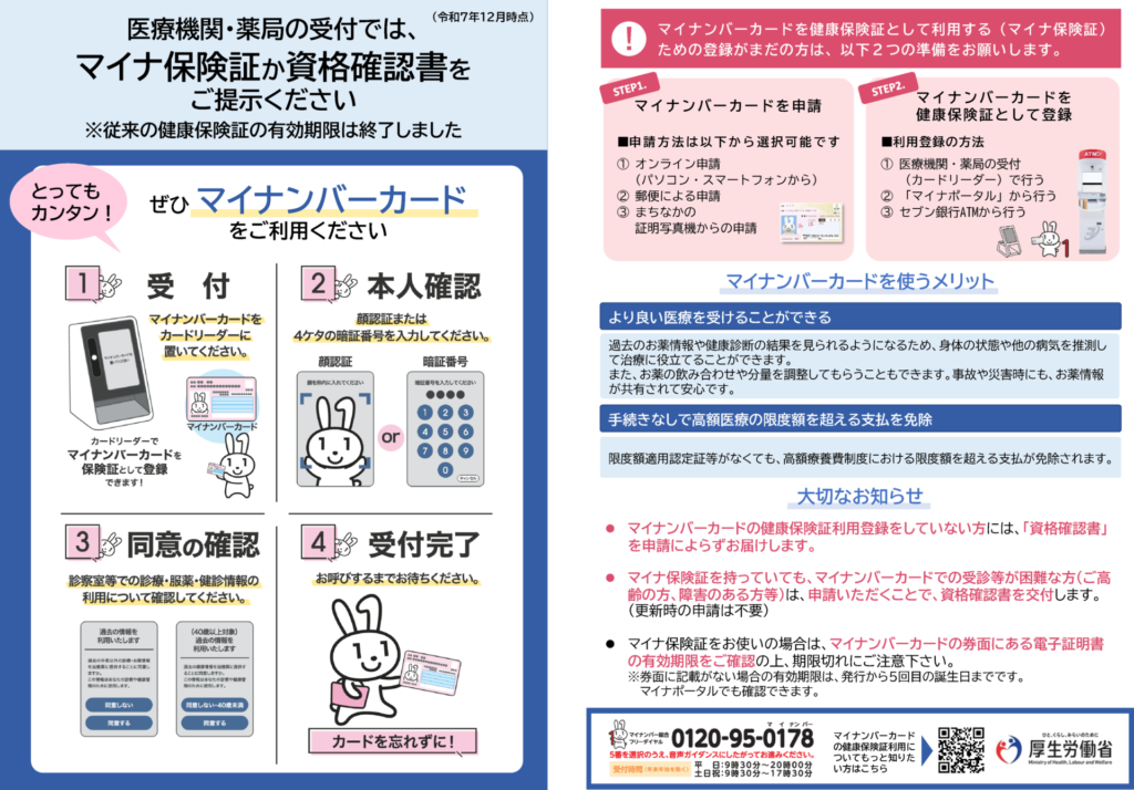 期限以降は「マイナ保険証(マイナンバーカード)」または「資格確認書」をご提示いただくことで、これまで通り保険診療を受けることができます。